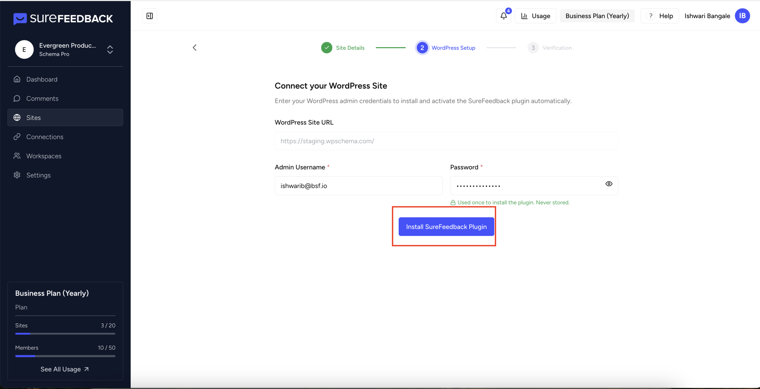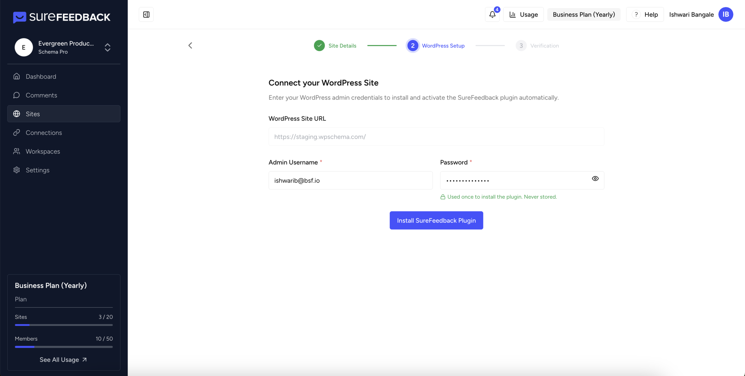 - Fill in your WordPress admin username and password. This information allows SureFeedback to set up the connection automatically.