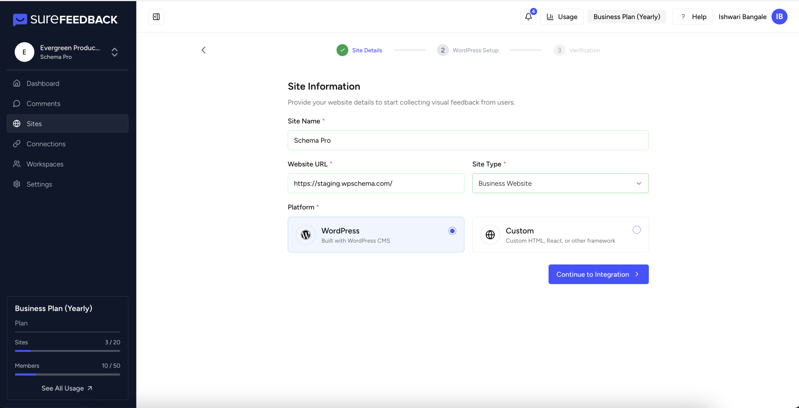 - Follow the on-screen instructions to confirm that everything is set up correctly. Once verified, your website will appear in your SureFeedback dashboard and in the Sites tab, ready to start collecting feedback.