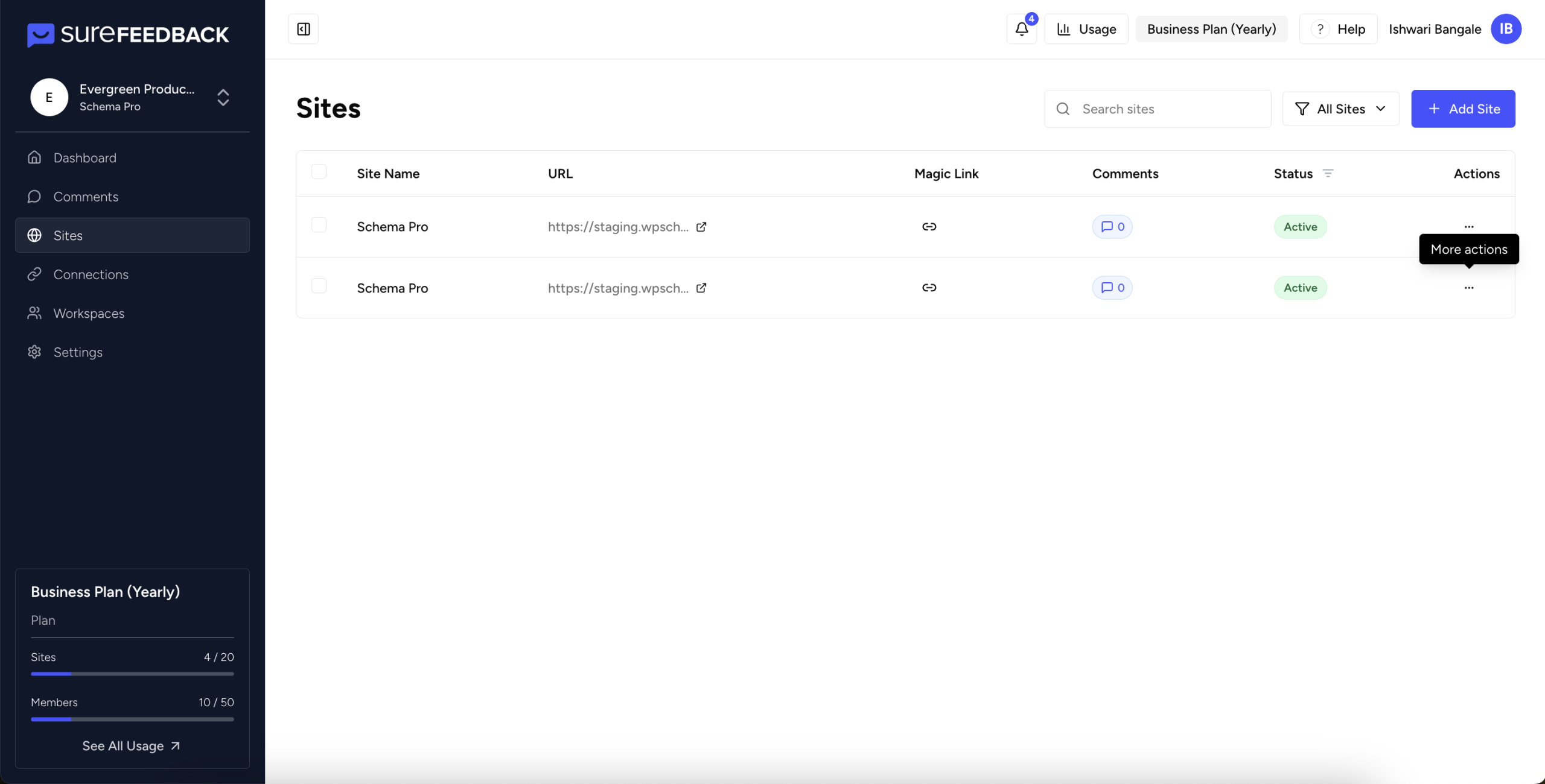 - In the dashboard, click on the Add New Site button located at the top right corner. This will start the process of adding your website to SureFeedback.